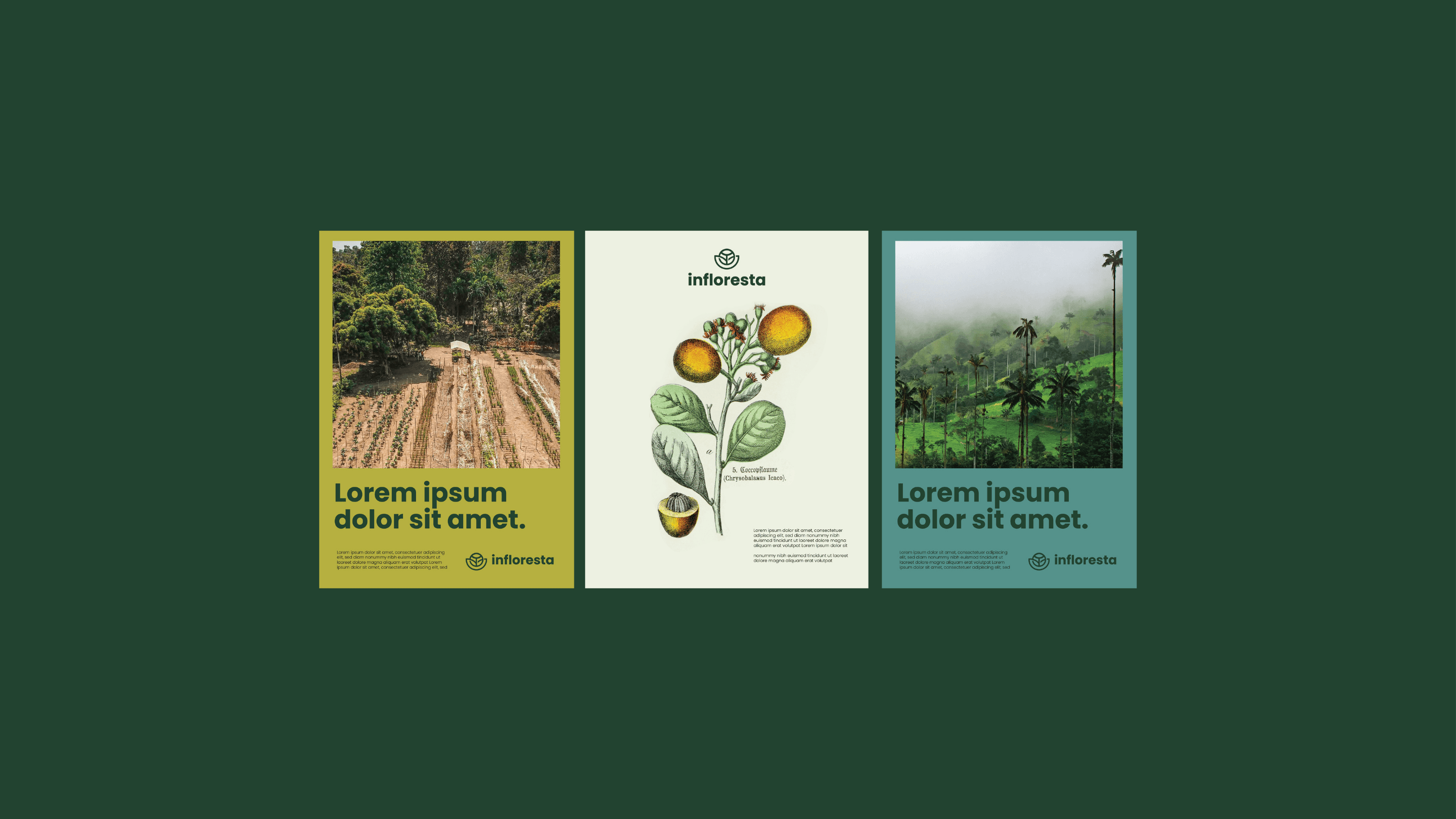 Partimos da essência do nome InFloresta, que une “info” e “floresta”, para criar um sistema visual capaz de sustentar essa integração. O logotipo representa mundo, vida vegetal e crescimento. A paleta equilibra seriedade institucional e vitalidade da floresta. O estilo de imagens aproxima território, pessoas e ciência de forma natural, enquanto os grafismos reforçam a ideia de rede e fluxo. O resultado é uma identidade flexível e inteligente, que traduz o propósito do projeto em todas as suas peças.